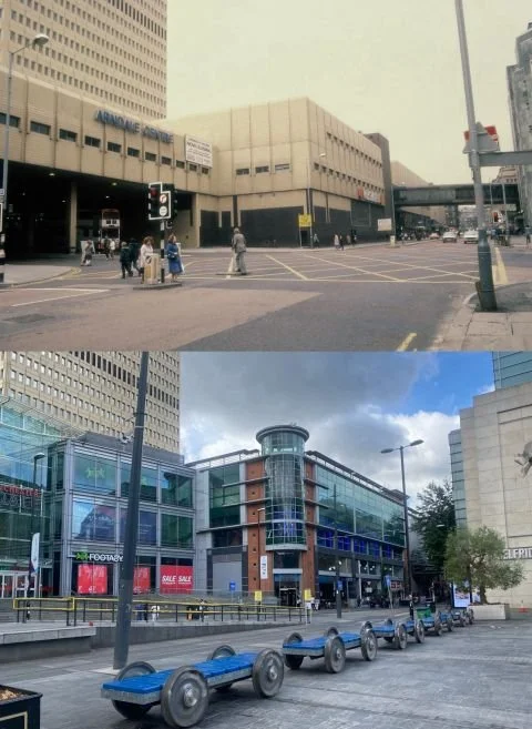 The more recent bottom photo is from what is now known as Exchange Square and shows the significant alterations that were made to the Arndale Centre from 1996 through to 2006. The Exchange Square Metrolink Stop also opened in 2015.