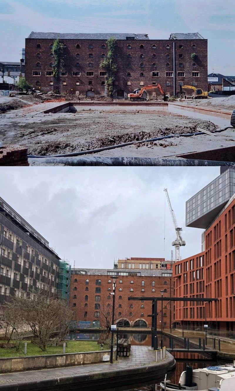 The new Piccadilly Basin in front of Jackson’s Warehouse was delivered in late 2001 with the infilled arm to the old canal warehouse excavated and expanded into this rectangular basin.